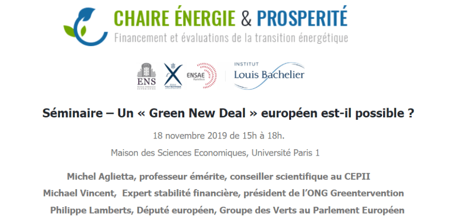 Le 18 novembre prochain, Michael Vincent, président de Greentervention, aura le plaisir et l’honneur d’intervenir aux côtés de Michel Aglietta et Philippe Lamberts lors du Séminaire #GreenNewDeal 🌱 organisé par la Chaire Energie et Prospérité à Paris. Détails et inscriptions ci-dessous :