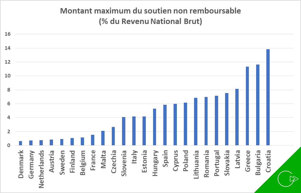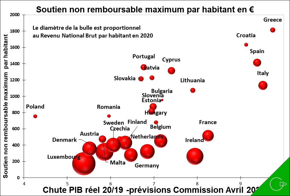 La facilité pourra néanmoins avoir des impacts macro économiquement significatifs dans certains pays parce qu’elle est fortement re-distributive (voir graphiques ci-dessous). La Commission a utilisé une clé qui assure que le montant maximal du soutien par habitant s’explique pour l’essentiel par l’ampleur de l’impact de la crise et le niveau de revenus par habitant. Pour les pays les plus affectés et au revenu par habitant les plus bas, les transferts pourront s‘étaleront entre 12 à 14 % du PIB sur trois ans. L’Espagne et l’Italie, deux pays fortement affectés, mais dont le revenu par tête est inférieur, mais proche de la moyenne européenne, pourront disposer de montants permettant d’alléger de façon non négligeable les contraintes qui pèsent sur leurs dépenses publiques.
