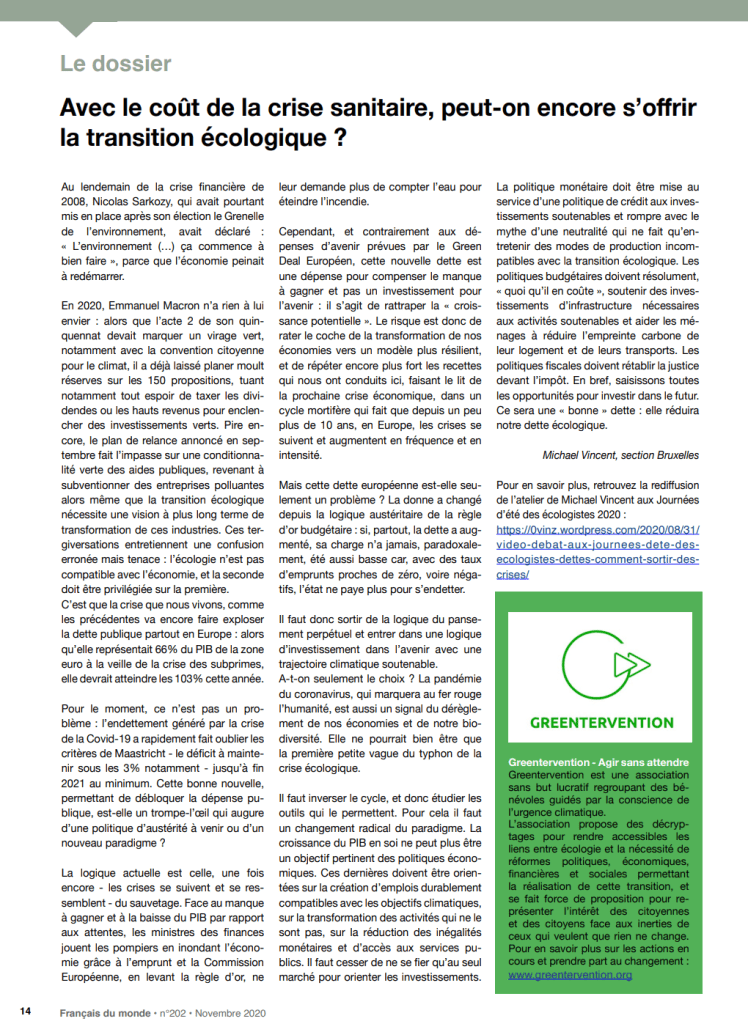 Michael Vincent, président de Greentervention, publie avec l’association Français du Monde un article dans leur dernier magazine spécial environnement – disponible gratuitement – sur le coût de la transition écologique à l’heure de la crise sanitaire et de l’augmentation de la dette publique, pour proposer un fact check sur le véritable poids de la dette face au risque climatique. Merci à eux.