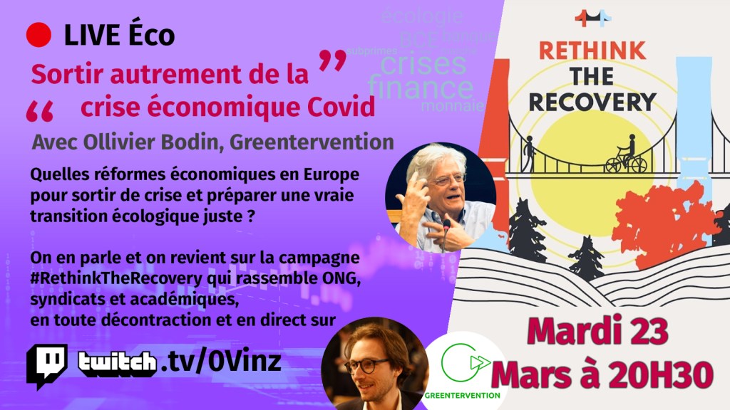 Greentervention vous propose de revenir sur la campagne #RethinkTheRecovery, les propositions de réformes budgétaires pour un avenir désirable et répondre à vos questions sur ce sujet brûlant sur la plateforme Twitch – http://twitch.tv/0Vinz – ce mardi 23 mars à 20h30 en direct. Venez nombreux-ses ! C’est libre d’accès et sans inscription.