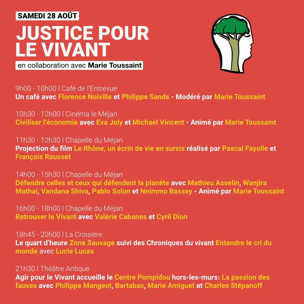 En particulier, la journée du samedi 28 août sera consacrée à la Justice pour le Vivant. En collaboration avec Marie Toussaint, députée européenne, cette journée de rencontre accueillera de nombreux débats, dont une table-ronde avec Eva Joly et Michael Vincent de Greentervention. La retransmission est disponible ci-dessous