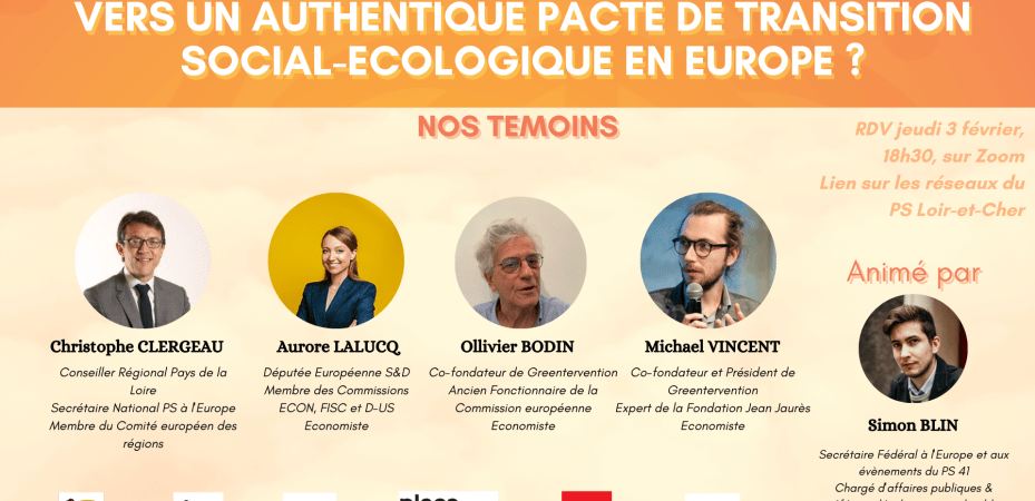 Greentervention est heureuse d’accepter l’invitation des socialistes du Loir-et-Cher qui proposent une conférence en ligne ayant pour sujet la transition écologique et sociale en Europe. La réunion est ouverte à tous et sera animée par Simon Blin, secrétaire fédéral à l’Europe du PS Loir-et-Cher.